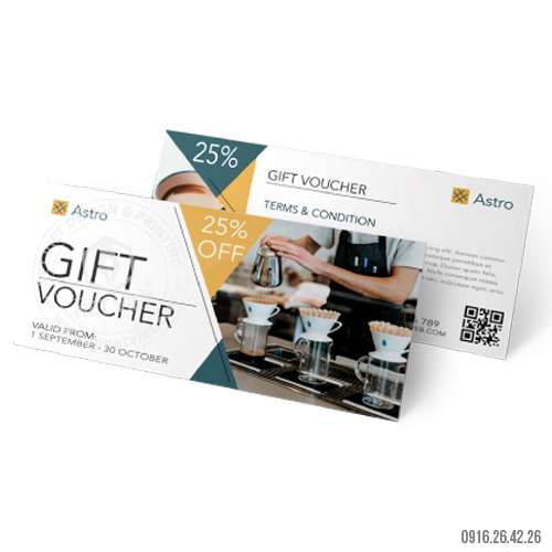 Một sản phẩm, dịch vụ chất lượng cao khi kết hợp với chương trình khuyến mãi, giảm giá chắc chắn sẽ thu hút khách hàng và ngay lập tức đẩy doanh số tăng vọt. In Gift voucher, In Phiếu Gảm Giá và gửi tặng chúng cho khách hàng giúp cho doanh nghiệp phổ biến chương trình khuyến mãi đến đúng đối tượng khách hàng với chi phí thấp nhất.